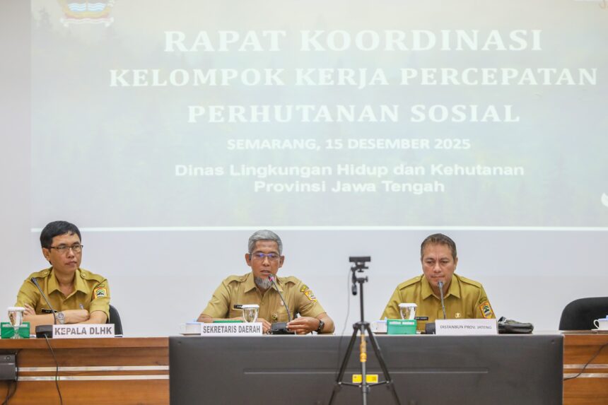Sekda Jateng Sumarno memimpin Rapat Koordinasi Kelompok Kerja Percepatan Perhutanan Sosial, di Kota Semarang, Senin, 15 Desember 2025. (Foto:Dok)