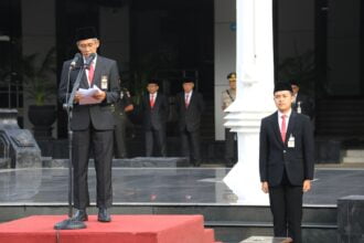 Sekda Provinsi Jateng Sumarno sedang membacakan sambutan dalam upacara peringatan…