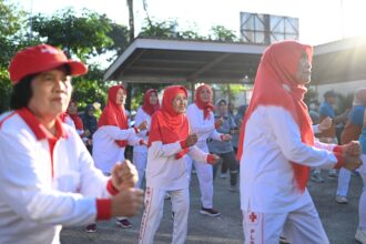 Para lansia tampak ceria melakukan senam bersama di Pedurungan Semarang,…