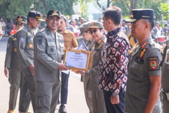 Taj Yasin menyerahkan penghargaan kepada Satpol PP yang berprestasi, Kamis,…