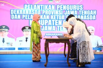 Nawal Arafah Yasin menyaksika penandatanganan pelantikan/pengukuhan Pengurus Dekranasda, di Semarang,…