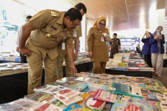 Nana Sudjana mengamati buku-buku yang dipajang di Perpusda…