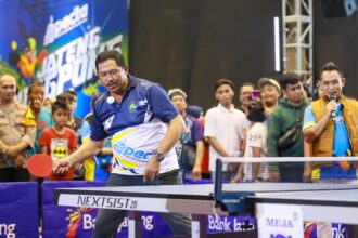 Pj Gubernur Nana Sudjana berusaha mengembalikan bola, saat…